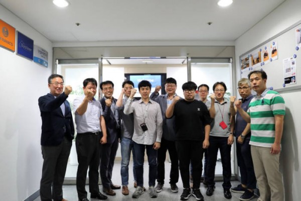 <스마트 ICT 플랫폼기업을 선언한 인프라닉스 송영선 대표이사(좌측 끝)가 Systeer Cloud Center에서 화이팅을 외치고 있다.>